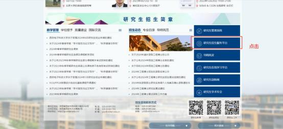 1.考生进入西安电子科技大学研究生招生服务平台,通过输入网 址(https://yjspt.xidian.edu.cn/gsapp/sys/wdyjsbm/entrance.do),或打开 研究生院官网(/)点击“研究生招生服务平台” 实现跳转。