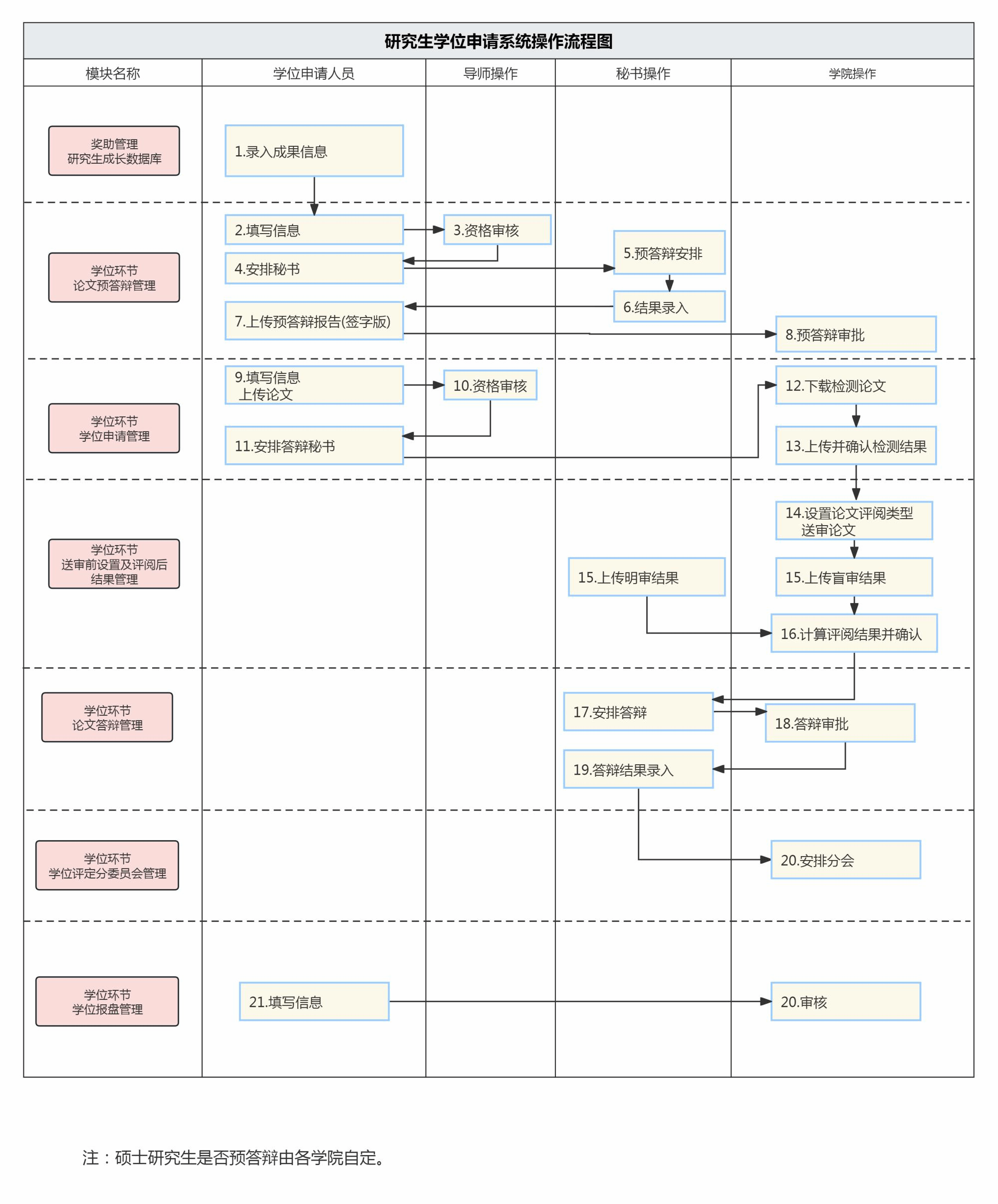 申请学位通过研究生管理系统进行,学位申请人员、导师、学院管理员及答辩秘书登录:西安电子科技大学研究生院主页“研究生管理系统”操作流程如下: