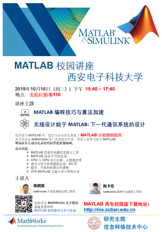 2019年10月16日下午15:40-17:40在北校区阶教110将举办MATLAB校园讲座,分为两大主题: