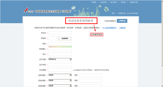 二、单击“注册”,进入学信网账号注册页面,请如实填写个人信息;