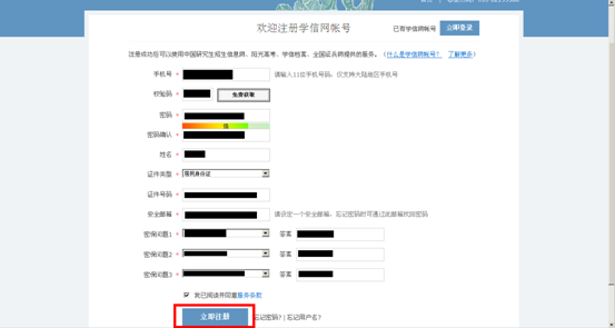 三、个人信息填写完成后,单击“立即注册”;学信网注册账号毕业前要核对个人图像等毕业信息,请同学们妥善保管好学信网个人账号和密码及其它注册信息。
