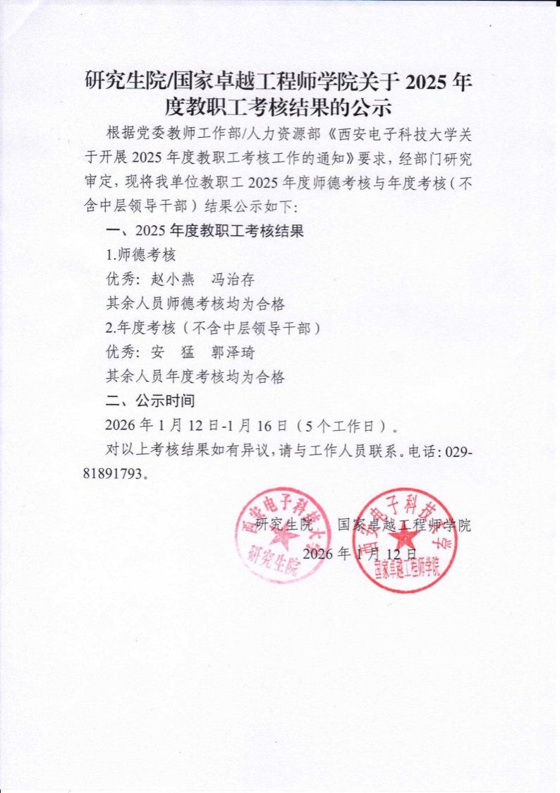 研究生院/国家卓越工程师学院关于2025年度教职工考核结果的公示