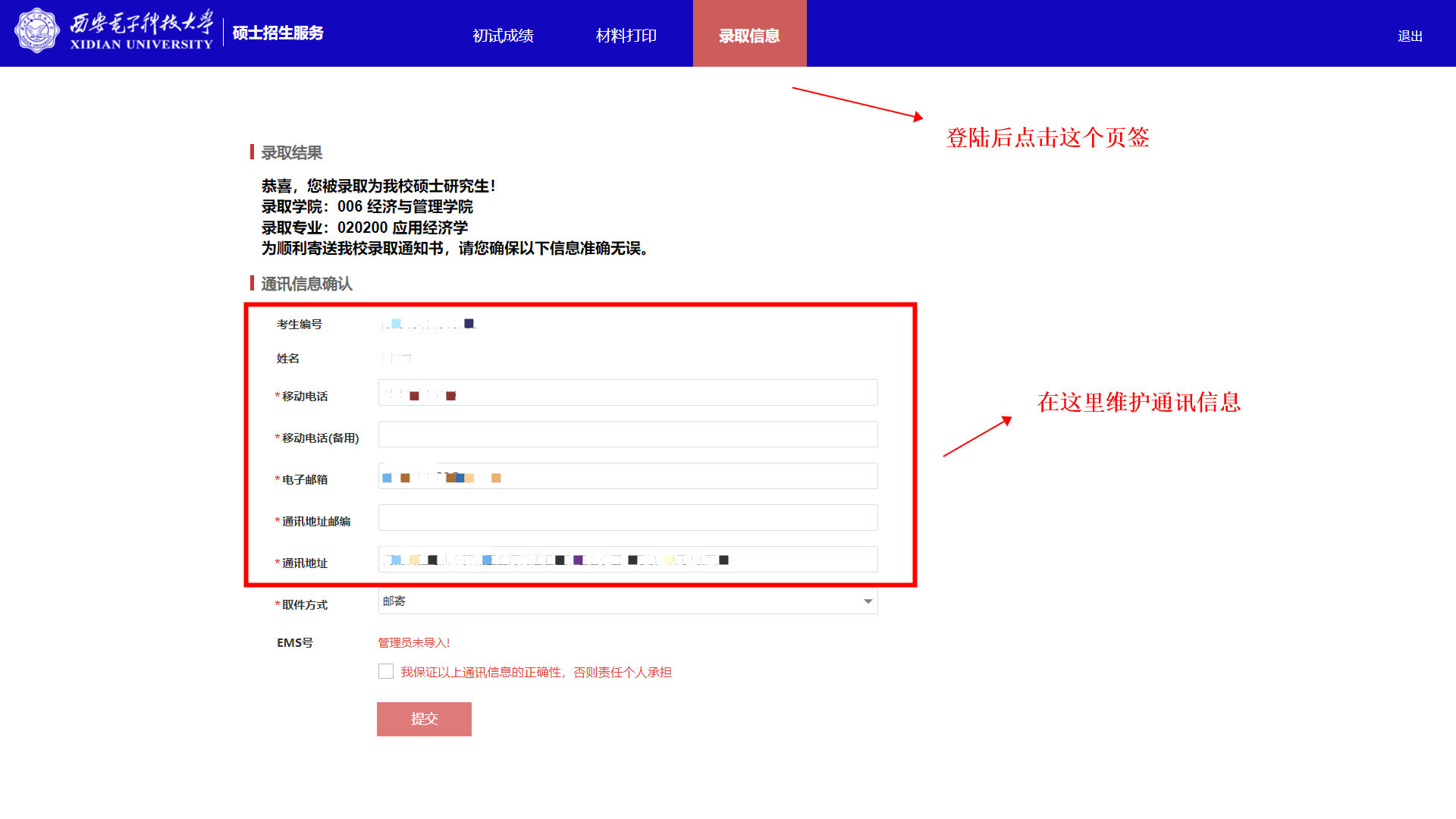 6.登录后选择录取信息模块进行通讯信息确认。