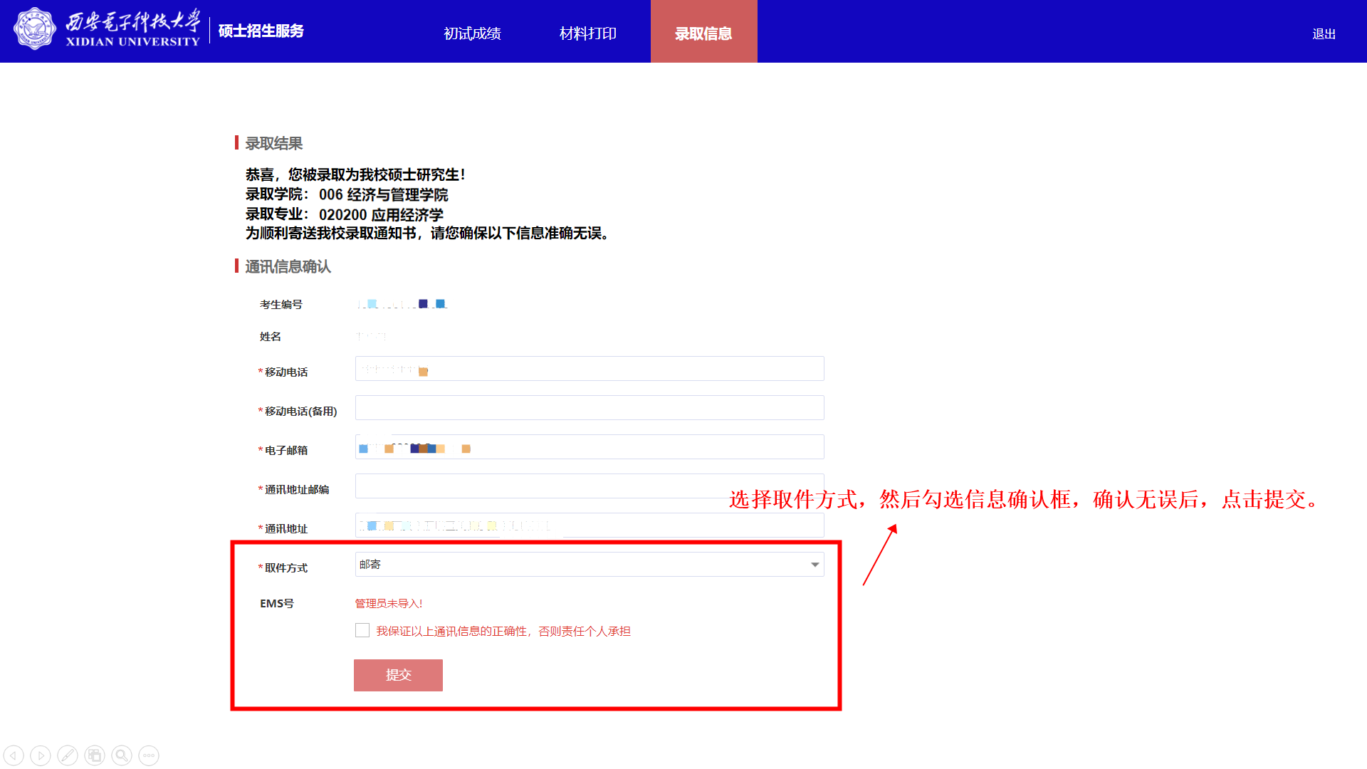 2.通知书取件方式可选择自取或邮寄(注意:所有考生均须登录系统确认取件方式,西电应届本科生的取件方式原则上为自取)。