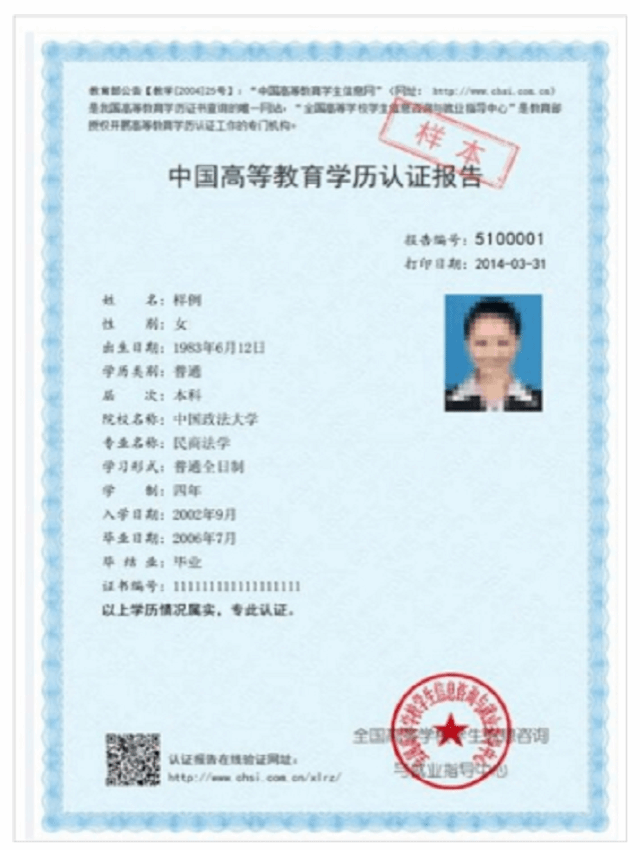《学历认证报告》示例照片