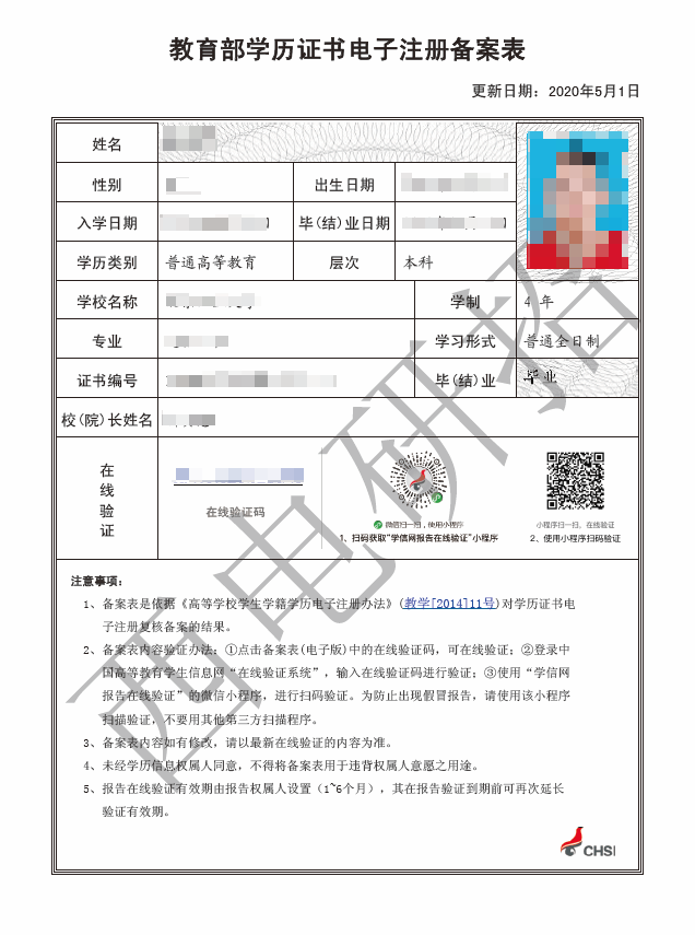 《教育部学历证书电子注册备案表》示例照片