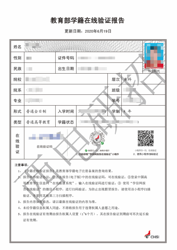 《教育部学籍在线验证报告》示例照片