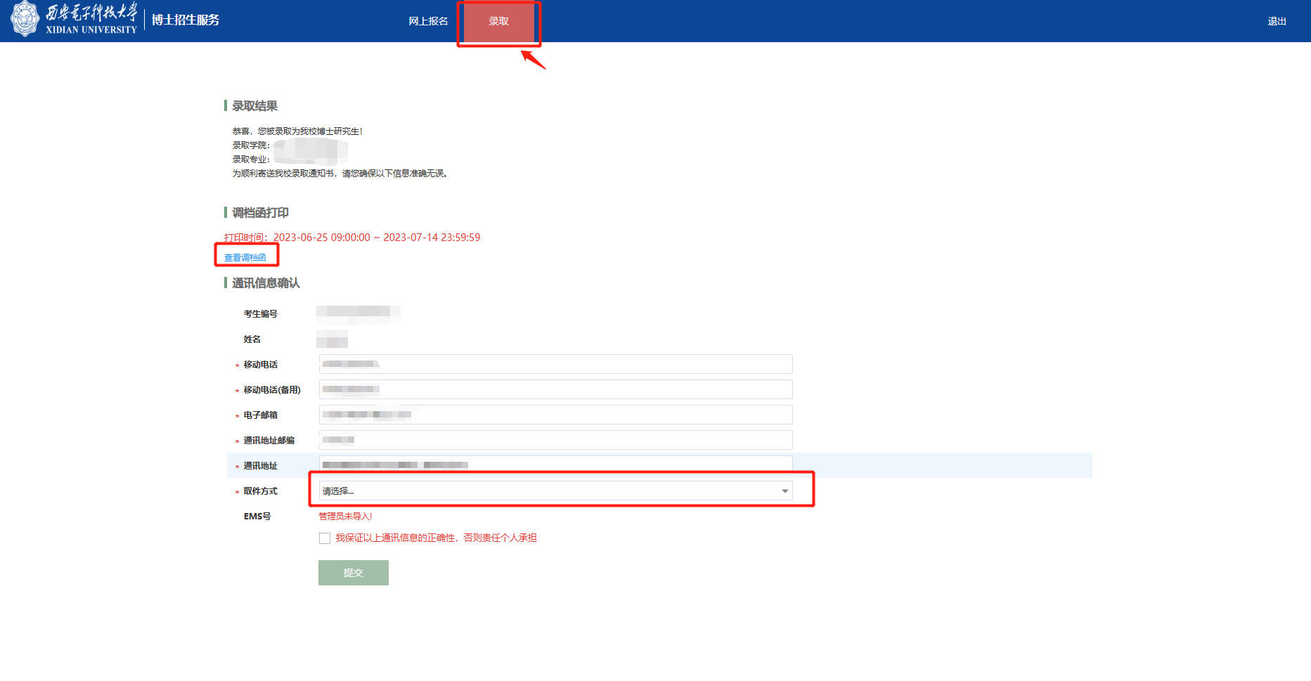 进入系统后选择录取模块进行调档函打印(定向就业考生不需要下载调档函),同时须进行录取通知书邮寄通讯地址确认,选择取件方式,勾选后进行提交。(注:地址确认后不可修改,请慎重填写)
