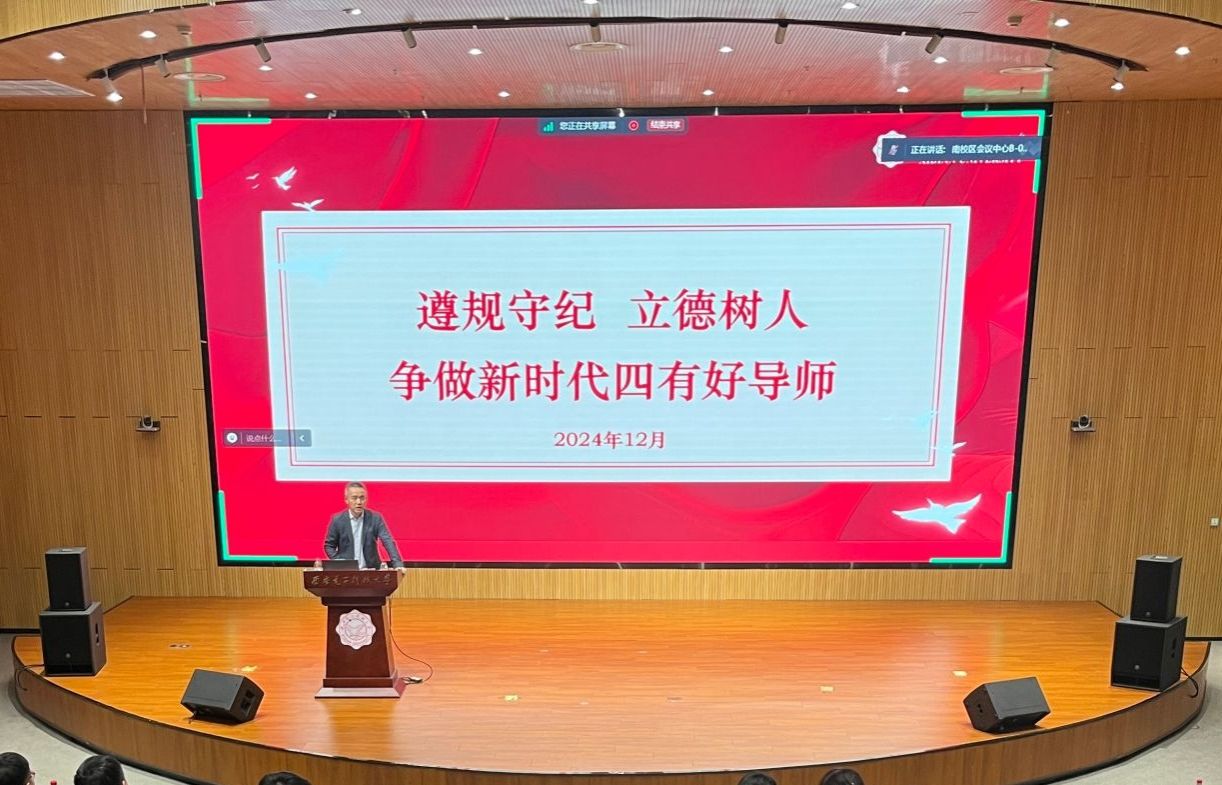 最后,郭俊副书记围绕“遵规守纪 立德树人 争做新时代四有好导师”主题,以“党纪学习教育”为主线,通过讲解深刻的教育案例,充分阐释了研究生导师坚持立德树人的首要职责和根本任务,为争做新时代四有好导师提供了指引。他谈到,导师是研究生培养的第一责任人,肩负着培养高层次创新人才的崇高使命,师德和纪律要求是研究生导师的行为底线。郭俊副书记生动讲解了研究生导师在遵守政治纪律、工作纪律、廉洁和群众纪律、生活纪律、科研诚信等方面的案例,指出研究生导师要知纪明纪守纪,守住底线、不碰红线、追求高线,以德立身、以德立学、以德施教,做研究生的良师益友,做教书育人的楷模典范。