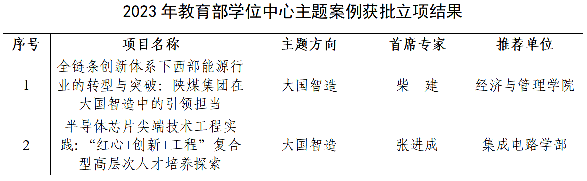 西电获批2项2023年教育部学位中心主题案例 近日,教育部学位与研究生教育发展中心公布了2023年主题案例立项结果,西电2项案例获批立项。 据悉,主题案例征集工作聚焦时代热点,由教育部学位与研究生教育发展中心每年面向全国研究生培养单位开展,旨在汇聚名校、名院、名家力量,开发具有时代性、引领性、学理性、创新性的高质量案例。2023年主题案例征集工作聚焦“走出去”“区域协调发展”“中华传承”“大国智造”四个主题,经过“单位审核推荐”“专家分组评议”“案例专家委审核”三级评议审核并进行结果公示。 案例教学和研究是推进教学改革、促进教学与实践有机融合、提升专业学位研究生实践能力的重要途径。学校多年来不断深化专业学位研究生教育改革,后续将进一步推进案例教学和案例资源建设工作,加强对优秀案例的培育、应用和推广,服务国家需求,推动研究生教育高质量发展。