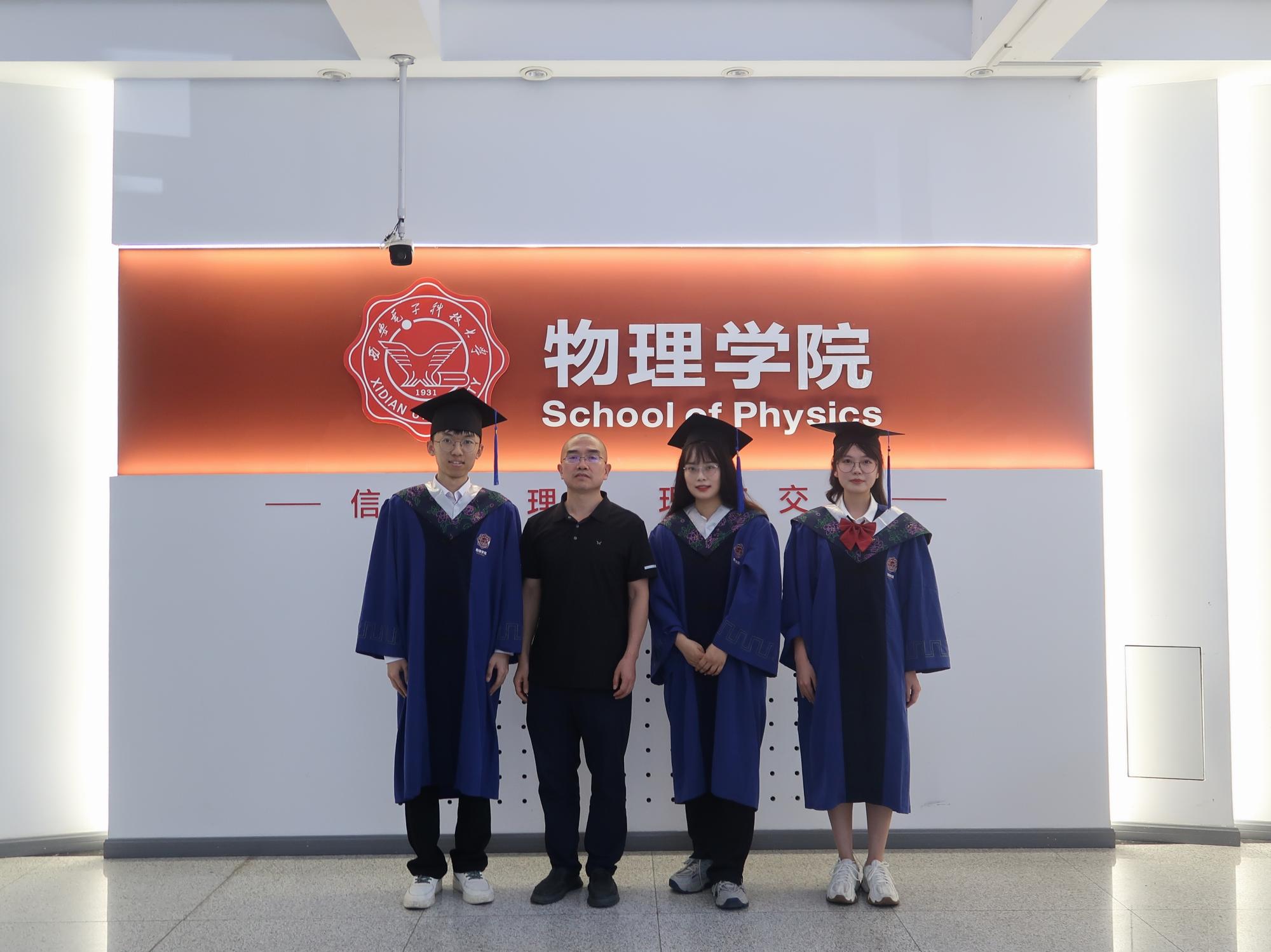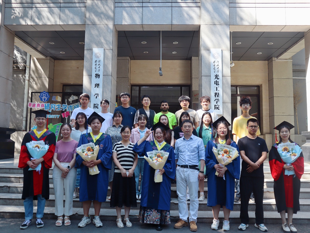 郜鹏老师本届共培养2名博士毕业生(左一温凯、右一于岚)、3名硕士毕业生(左三刘星、左五刘瑞桦、右三李娇月)。5名毕业生在校期间参与国家重点研发计划项目、国家自然科学基金重点/面上/青年项目等科研项目,以第一作者在Photonics Research、Applied Physics Letters等期刊上发表论文12篇,并多次入选期刊“封面文章”,申请发明专利4件、软件著作权1项,均获得过一等学业奖学金。温凯同学获国家奖学金、陕西省优秀毕业生、陕西省研究生创新创业大赛二等奖等荣誉,于岚同学获陕西省研究生创新创业大赛三等奖等荣誉,刘星同学入选2024届校优秀硕士学位获得者。温凯、于岚同学入职西安电子科技大学,李娇月、刘瑞桦同学分别前往南方科技大学、中国科学院大学读博深造,刘星同学入职中核陕西铀浓缩有限公司。愿五位同学前程似锦!